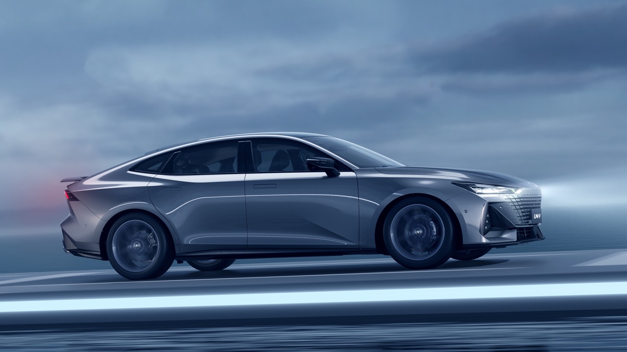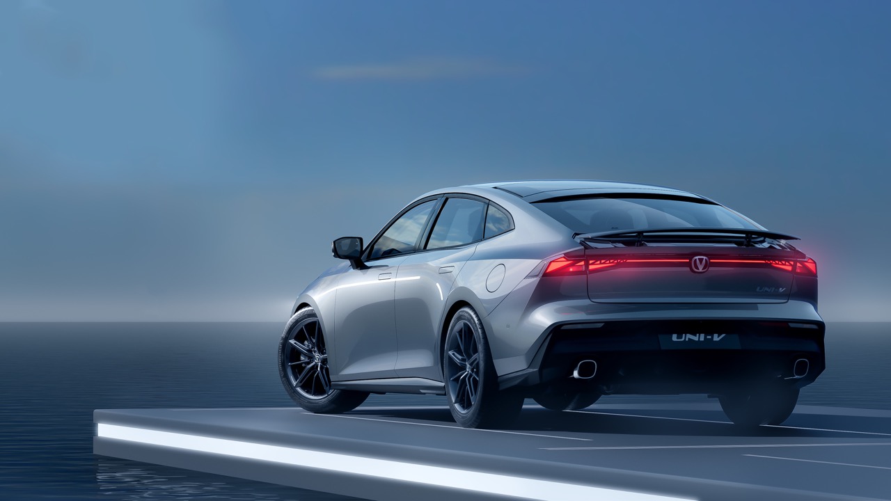 Боковой силуэт UNI-V — его главная фишка. Стремительная, покатая линия крыши плавно перетекает в интегрированный багажник с активным регулируемым спойлером, который выдвигается при достижении определённой скорости. Скрытые дверные ручки и мощные колёсные арки с дисками большого диаметра завершают образ автомобиля. Задняя часть с полносветодиодной оптикой в виде двойного икса и массивным диффузором с двумя парами выхлопных патрубков подтверждает спортивные амбиции модели.